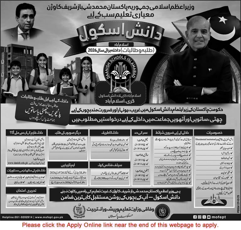 Scholarships / Admission for 6th, 7th & 8th Class Students in Daanish School Islamabad 2026 Pakistan
