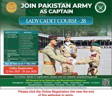 Enlist in the Pakistan Army as a Captain in December 2025 / 2026 via the latest online registration for the Lady Cadet Course.