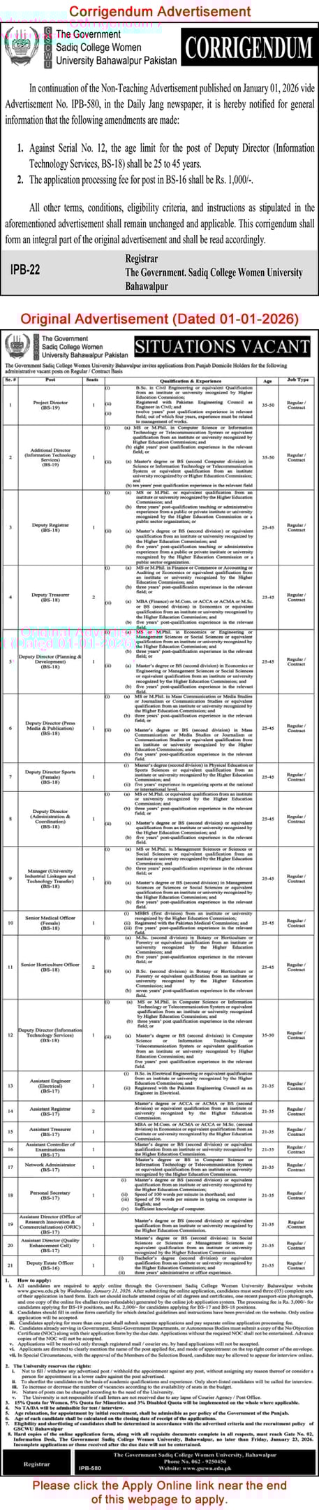 This article provides comprehensive information regarding the Non-Teaching Job Vacancies for 2026 at Sadiq College Women University Bahawalpur (SCWUB), encompassing the initial advertisement as well as the corrigendum notice released on 11 January 2026. It outlines all available positions, revised age limits, modifications to the application fee, eligibility criteria, and detailed instructions on the application process.
