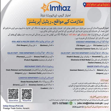 Imtiaz Super Market, recognized as one of the largest and fastest-growing retail chains in Pakistan, has announced several job openings for its locations in Rawalpindi and Islamabad. The company is seeking skilled, experienced, and dedicated individuals across various departments, including Fish & Meat, Bakery, Restaurant, Food & Non-Food Sales, Logistics, and Checkout Operations. These roles are well-suited for candidates looking to begin or further their careers in the retail industry. Available positions include cashiers, helpers, bakers, chefs, fishmongers, butchers, loaders, goods receiving personnel, sales associates, and logistics staff. Imtiaz provides a professional work environment along with opportunities for skill enhancement. Prospective candidates are required to bring their updated CV, original CNIC, and educational documents for walk-in interviews.
