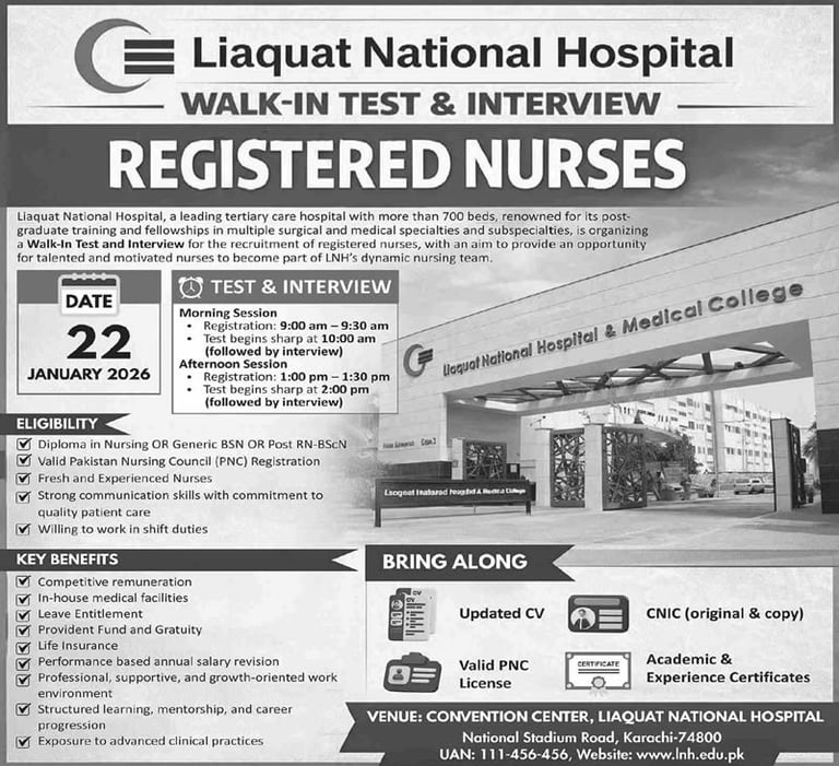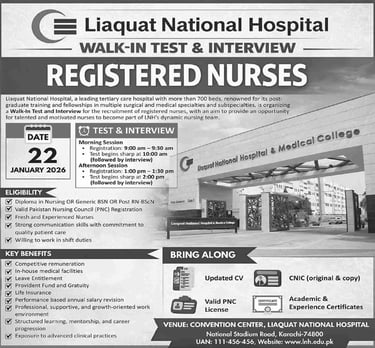 Liaquat National Hospital, recognized as one of the largest tertiary care facilities in Karachi, boasting more than 700 beds and esteemed for its postgraduate training programs, has declared the initiation of walk-in tests and interviews for the recruitment of Registered Nurses. The hospital seeks to employ both newly graduated and experienced nurses who are dedicated to providing high-quality patient care and are eager to work in a vibrant healthcare setting.